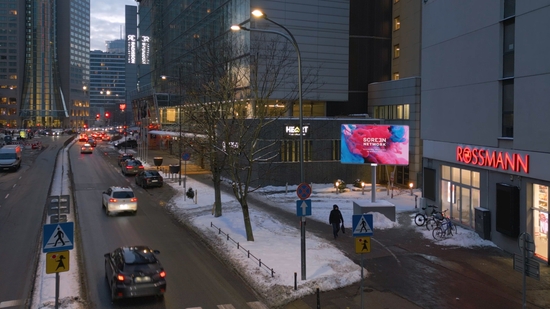 Ekran reklamowy zlokalizowany przy ul. Grzybowskiej, na odcinku prowadzącym w stronę alei Jana Pawła II – jednej z najważniejszych arterii w centrum Warszawy. To prestiżowa, śródmiejska lokalizacja, w bezpośrednim otoczeniu nowoczesnych biurowców, hoteli, apartamentowców i punktów usługowych.