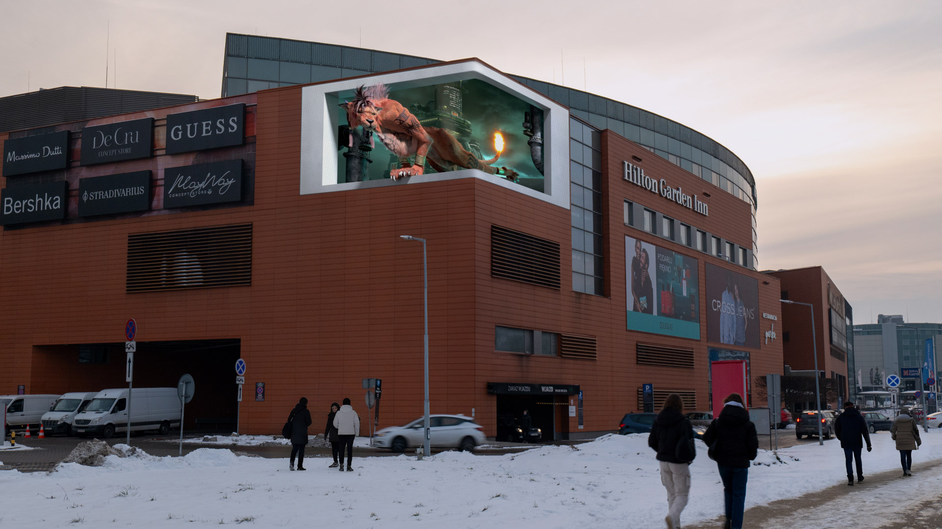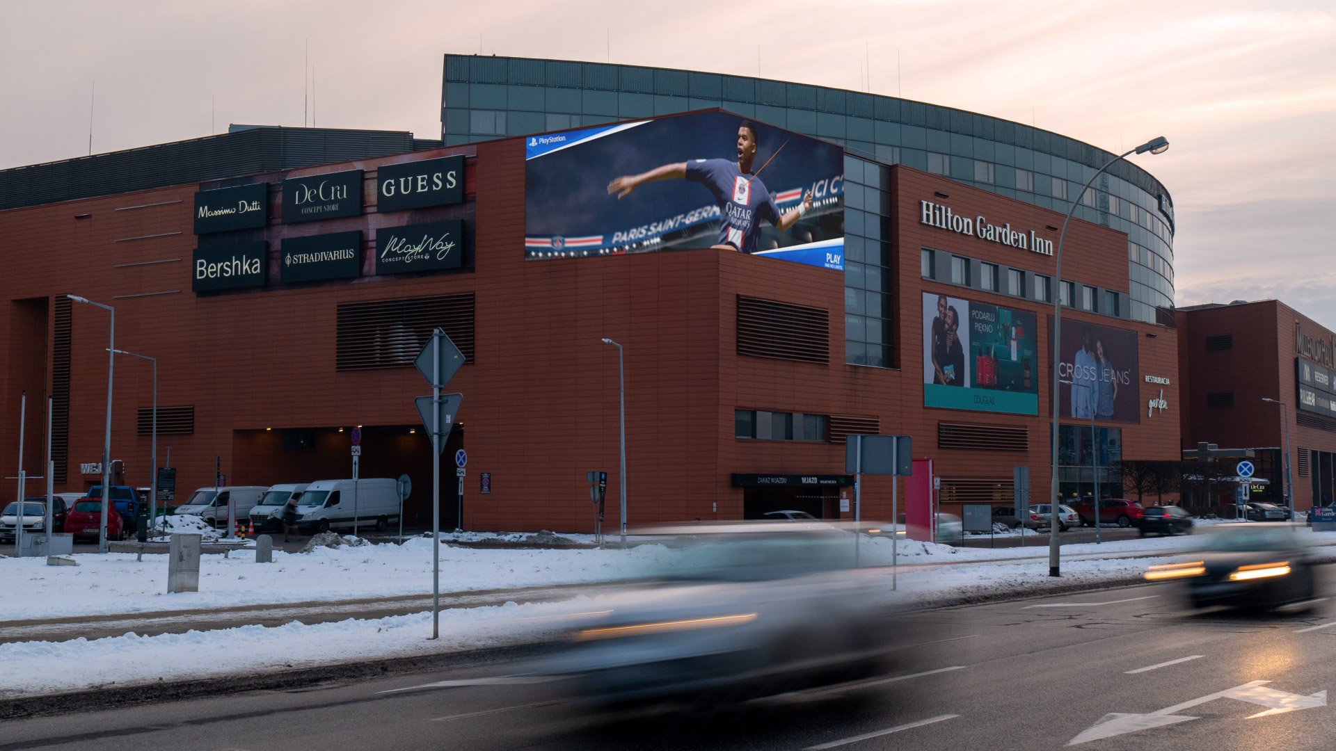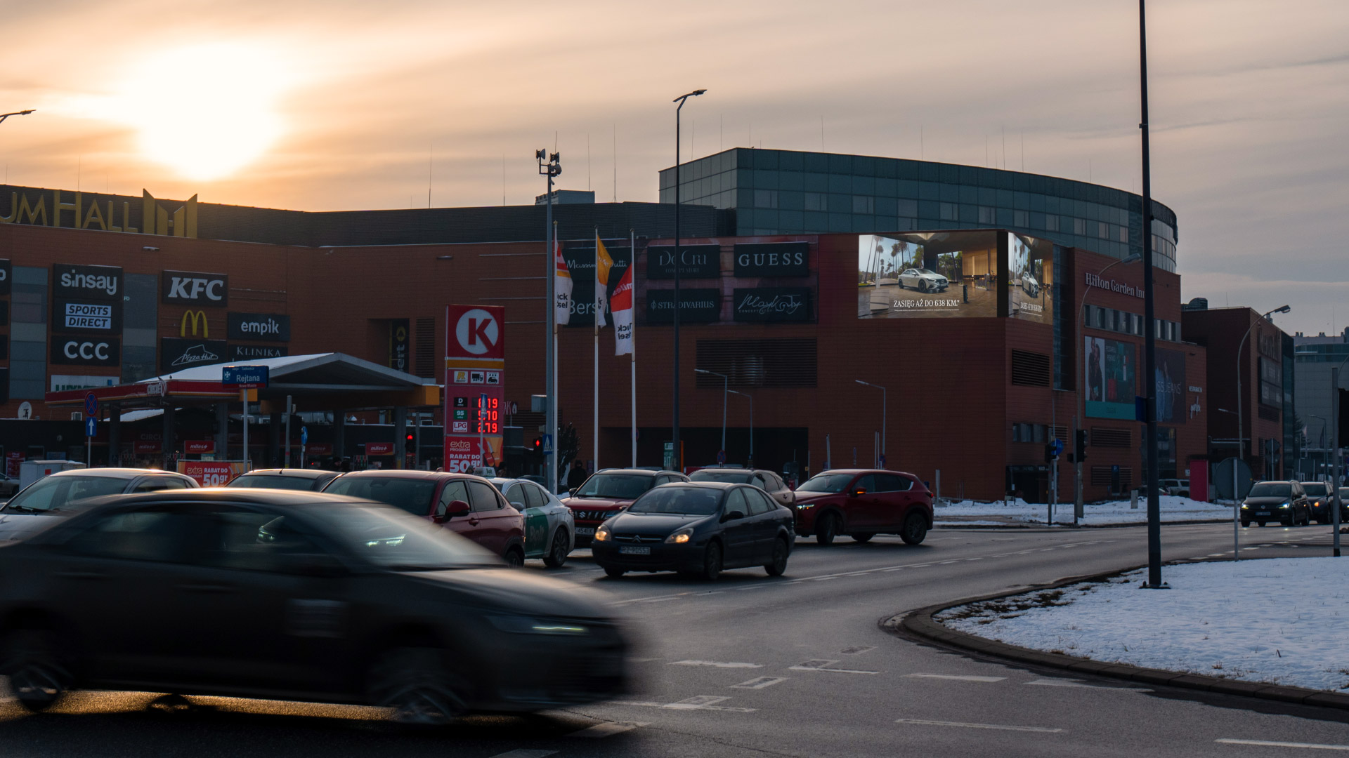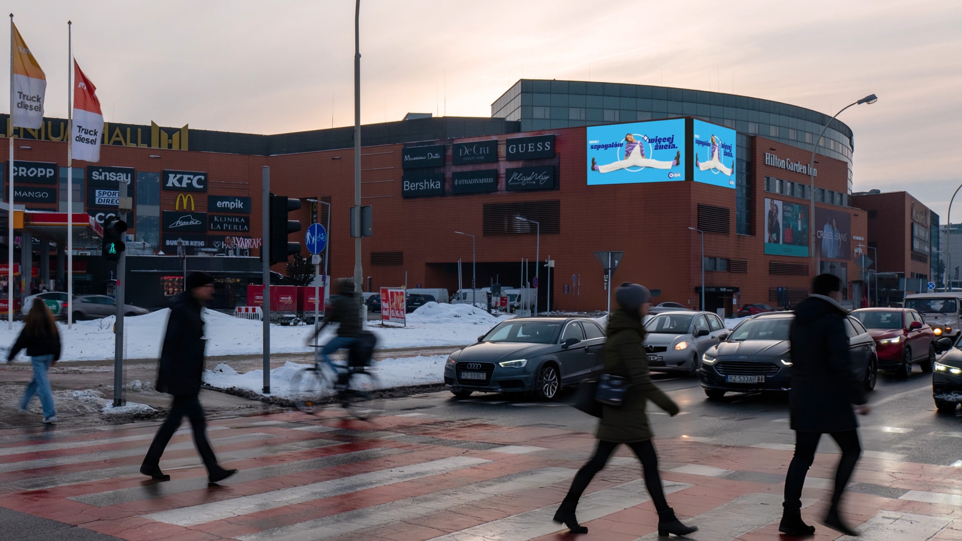 Wielkoformatowy, narożny ekran reklamowy zlokalizowany przy jednym z najważniejszych skrzyżowań Rzeszowa, umieszczony na fasadzie Millenium Hall – jednego z najbardziej prestiżowych i najczęściej odwiedzanych centrów handlowych w regionie.