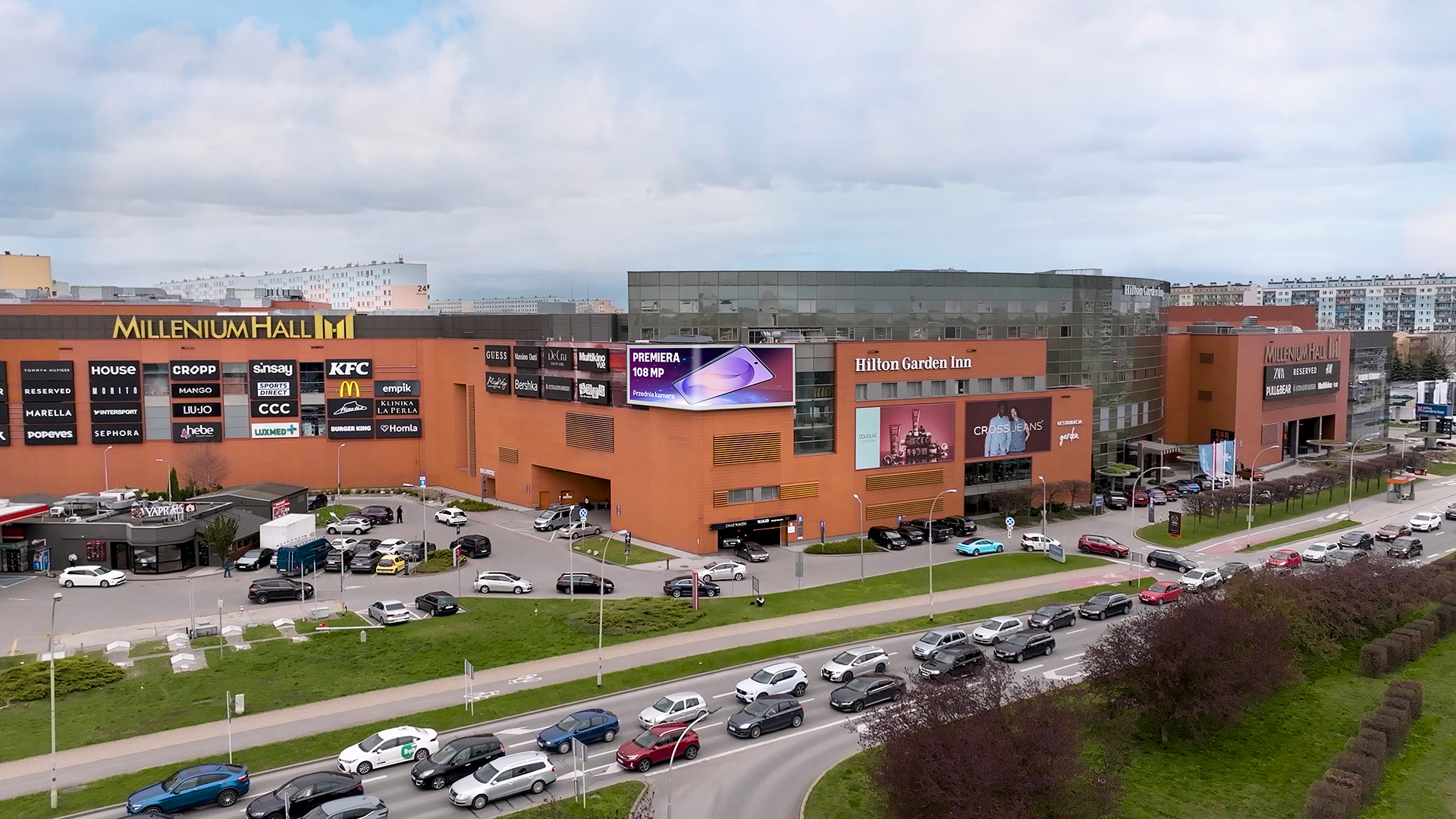 A large-format, corner advertising screen located at one of Rzeszow’s key intersections, mounted on the front of Millenium Hall – one of the region’s most prestigious and frequently visited shopping centres.