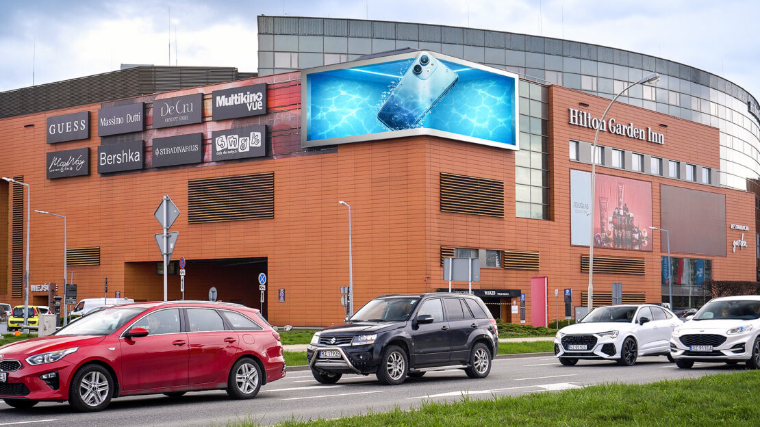 Kluczowym wyróżnikiem ekranu jest możliwość emisji spotów anamorficznych, wykorzystujących iluzję głębi i efekt „wychodzenia” obrazu poza ekran. Odpowiednio przygotowane kreacje 3D pozwalają uzyskać spektakularny efekt wizualny, który przyciąga uwagę odbiorców z dużej odległości i wzmacnia zapamiętywalność kampanii. To format, który jest kojarzony z największymi aglomeracjami i najbardziej prestiżowymi lokalizacjami reklamowymi.